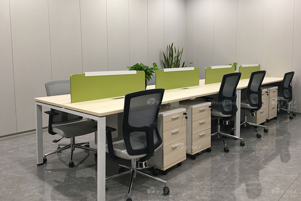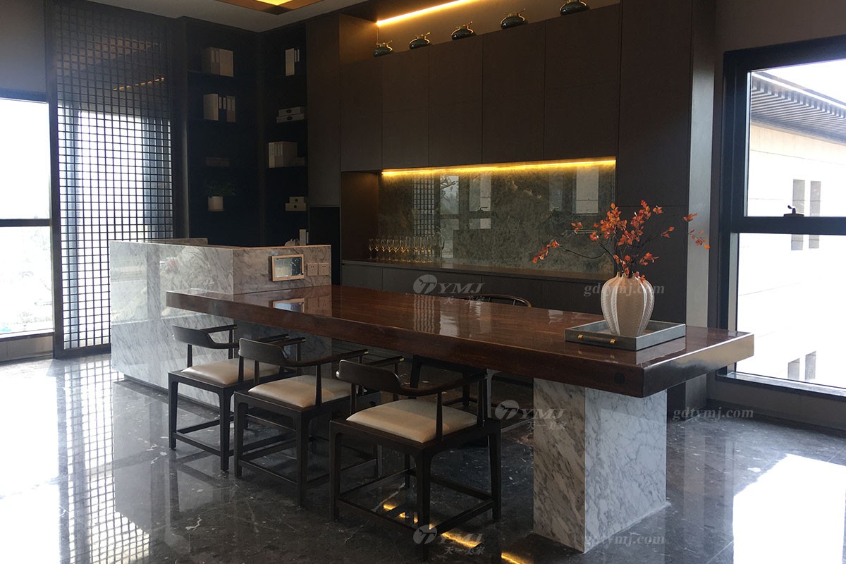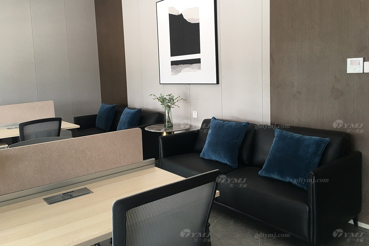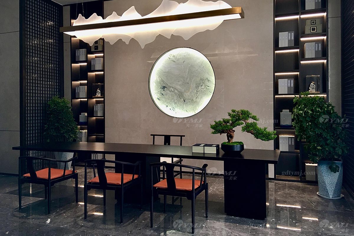辦公區的辦公家具,選色鮮明,檸檬綠作為隔離板。整體感覺活躍充滿活力。董事長辦公室,依然是選用新中式的風格為主。大理石的背景墻與吊燈搭配,把吊燈的光反光在背景大理石上,頓時辦公室里氣場十足,高端而不奢華,沉穩而不高調。圓形餐桌的黑金色搭配,詮釋出既張揚又穩重的豪奢感。暗金色帶菱格紋的皮革,精細地包裹于餐椅的黑色框架中,柔和洗練的腿部線條以一點點的鍍金,呼應了整套組合,演繹了360度無死角的完美效果。