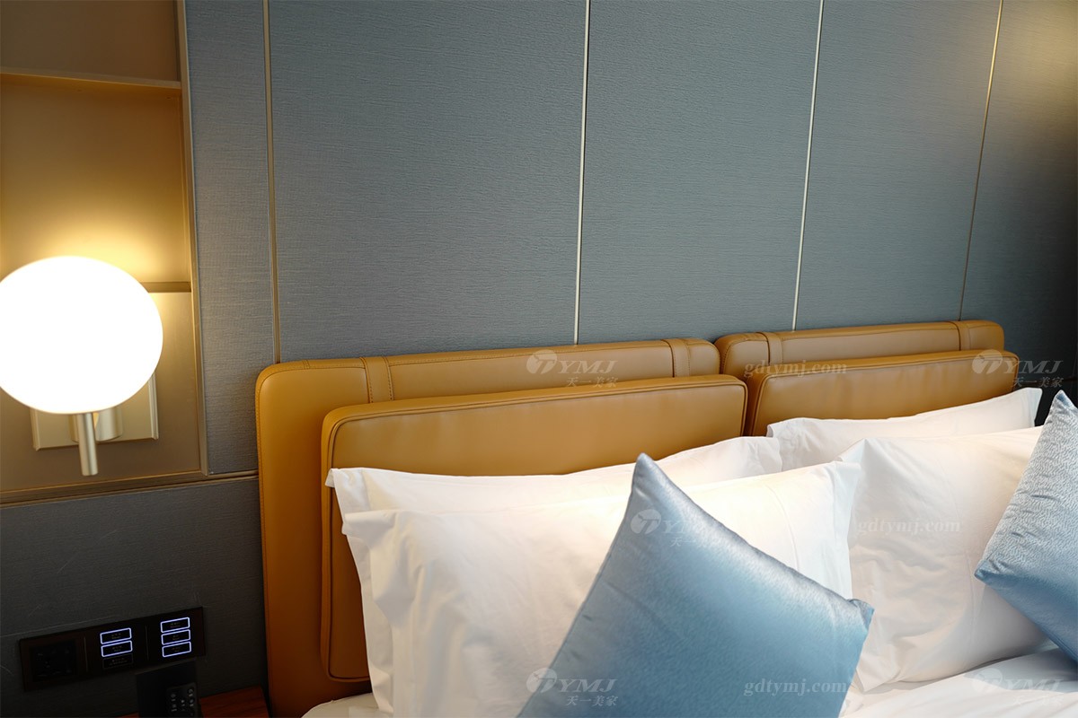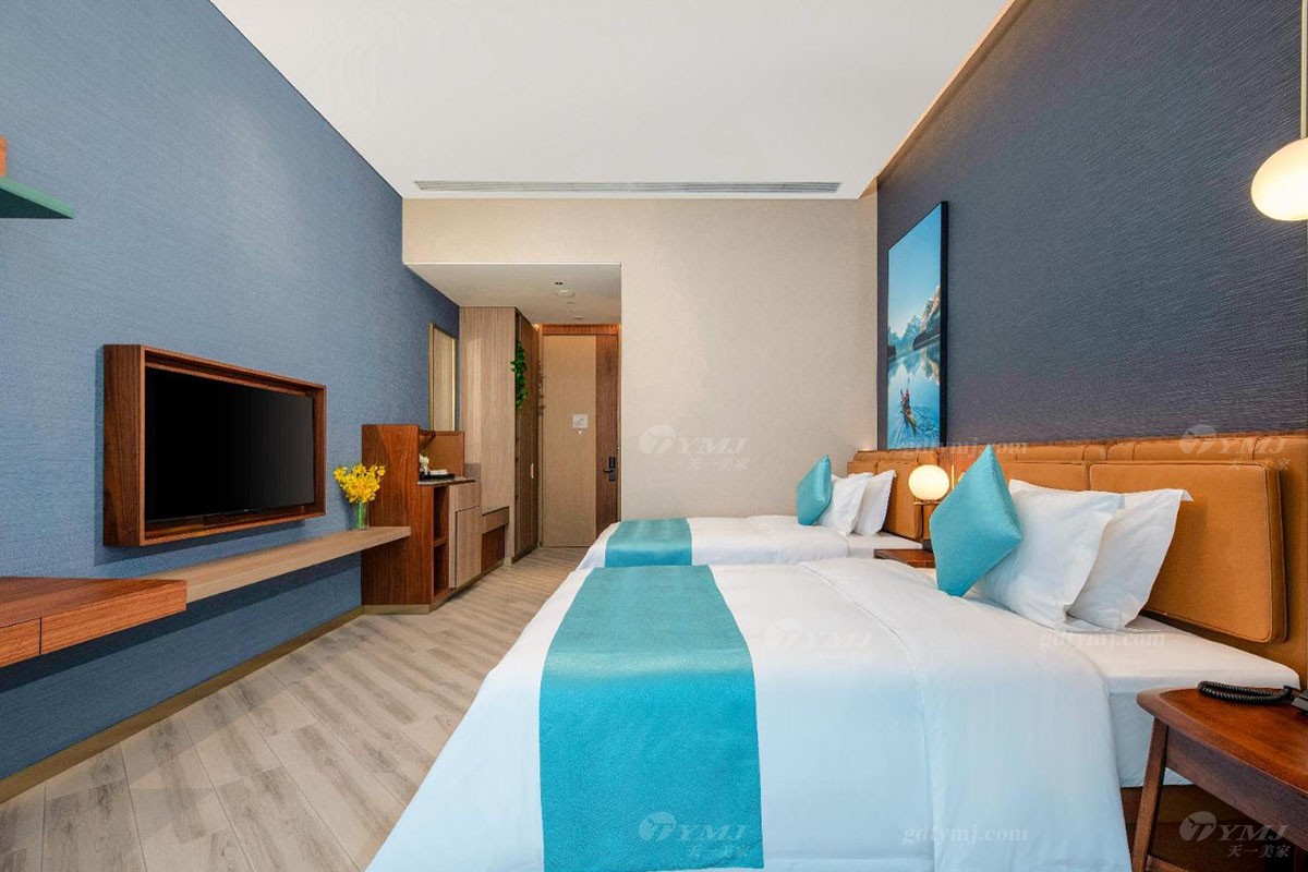雅致雙床房首先映入眼簾的是一整面灰藍色純色裝飾的背景墻,色調略顯深邃而寧靜;兩張橘黃色皮藝大床鋪上藍、白色系的床品,顯得既優雅舒適又充滿清爽活力,與背景墻灰藍色的基調相映成趣,使得整個空間地多增添了幾分溫馨、和諧。