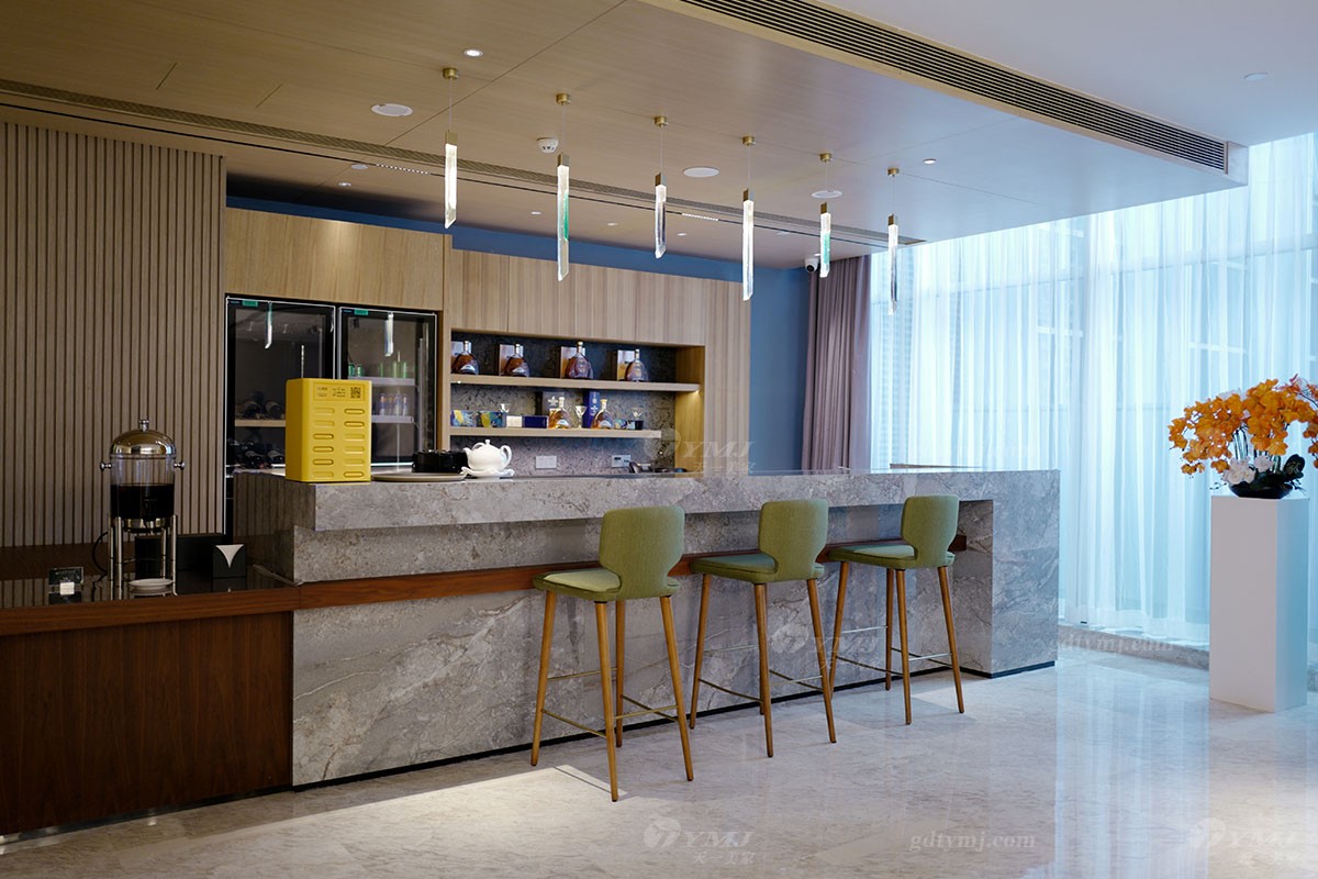 穿過電梯過道,即是酒店前臺服務大堂,空間敞亮,原木色木條裝飾而成的吊頂,造型獨特的不銹鋼金屬球形燈,別具一格。隔壁的吧臺由實木結合大理石打造而成,旁邊一張兩米多實木長功能桌,紋理深邃細膩,凸顯高質感和檔次,可以點一杯咖啡,坐在吧椅上跟朋友一起細細品味、隨意聊天,很是愜意。
