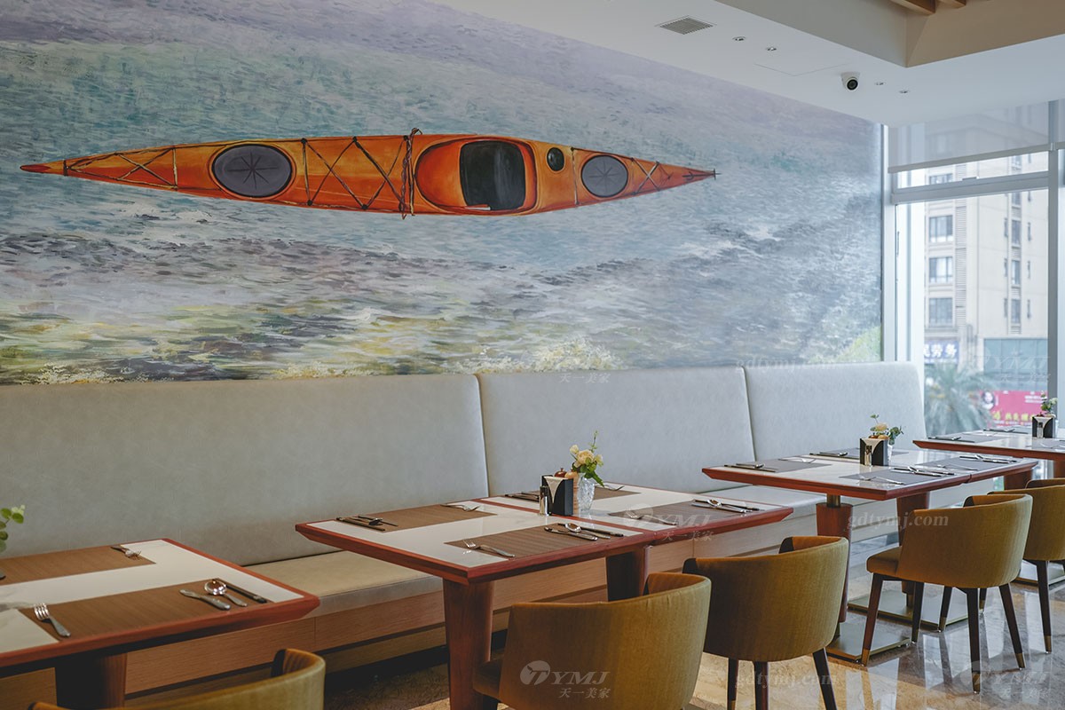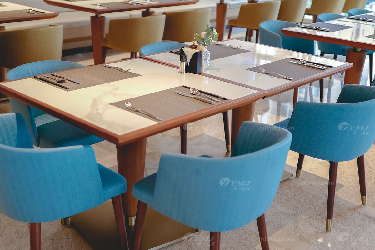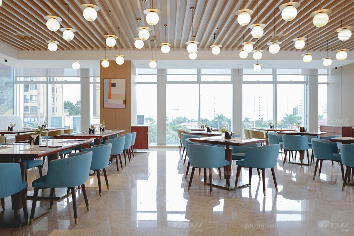 清新雅致的酒店自助餐廳,空間寬敞明亮,實木方形的小餐桌,表面紋理質樸、觸感溫潤,金屬底座的巧妙融入,帶來很強的時尚現代感同時多了一份優雅,精心制造的北歐風實木餐椅,藍色和嫩綠色的布藝椅面相得益彰,整個餐廳呈現出清新自然、北歐風情滿滿的氛圍,瞬間打開你的味蕾,沉浸于這份難得的寧靜與美食的享受當中。