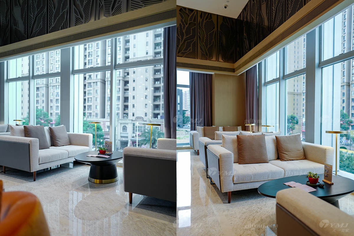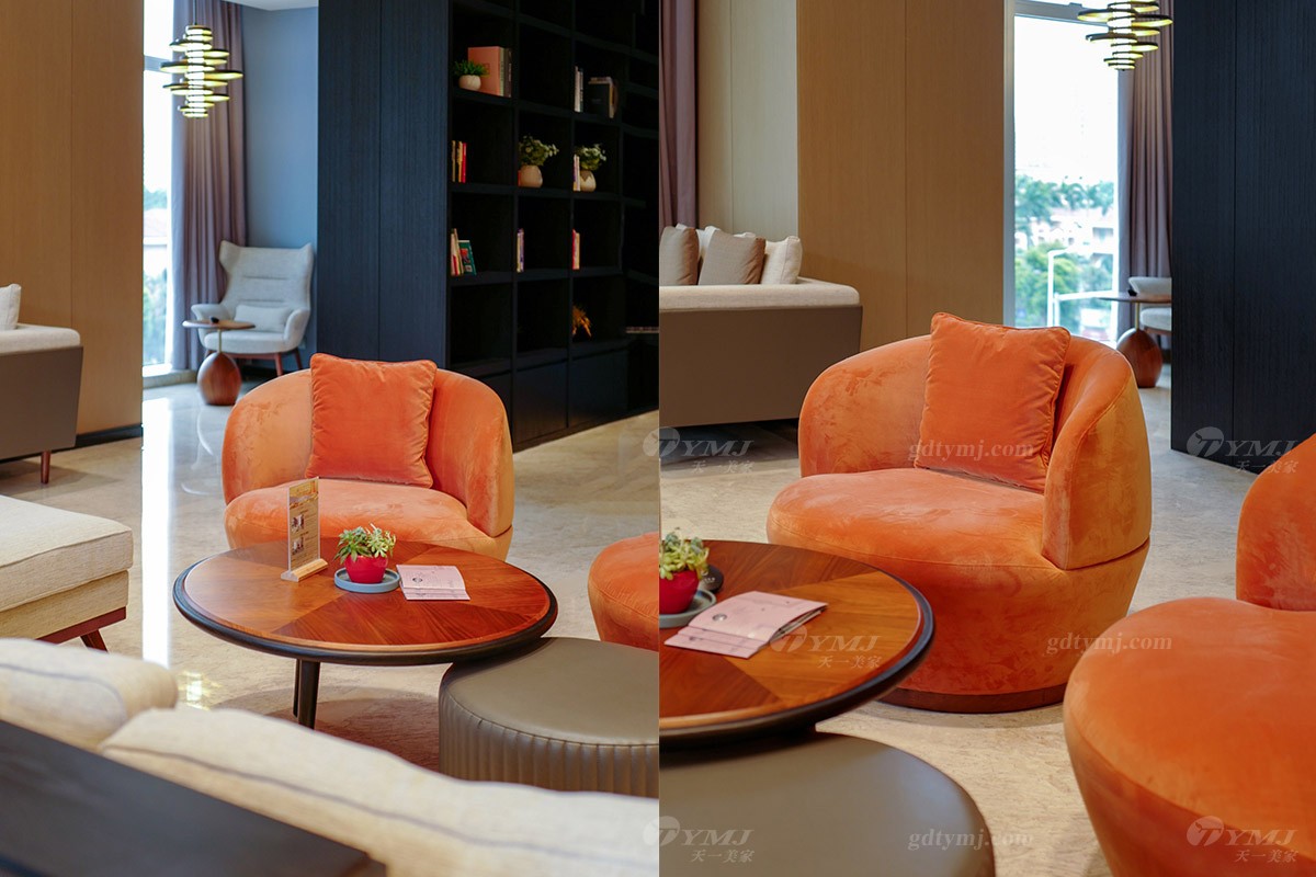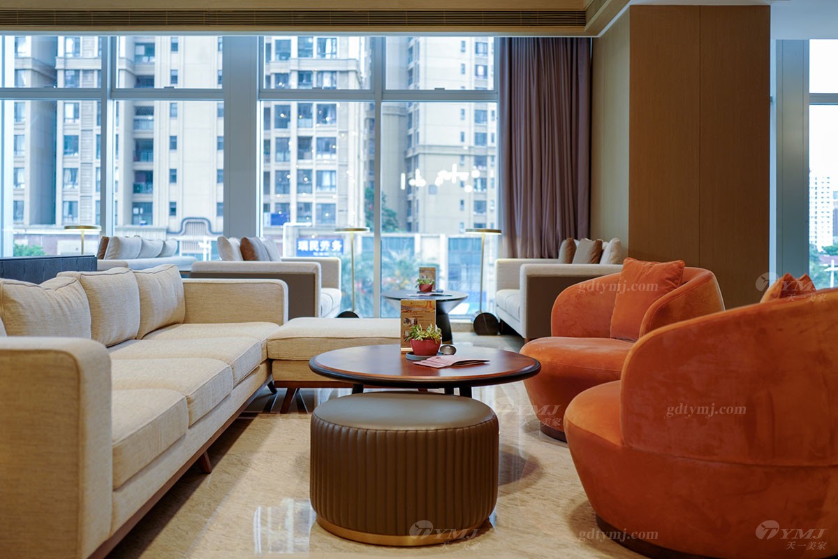 公共休閑洽談區擁有270°全景超大落地窗,自然采光非常充足,挑高的天花頂,讓空間通透明亮,柔和的燈光下,整體呈現灰色調布藝沙發中散落幾抹亮橙色休閑椅,使得整個氛圍活躍起來,搭配精致的裝飾,讓每一處細節都透露著不凡的品味。在繁忙的旅程或商務日程中,這是一處不錯的靜謐而又不失格調的休憩之地,坐在舒適沙發上既可覓得片刻寧靜的個人時光,亦或可與重要伙伴閑聊、會談。