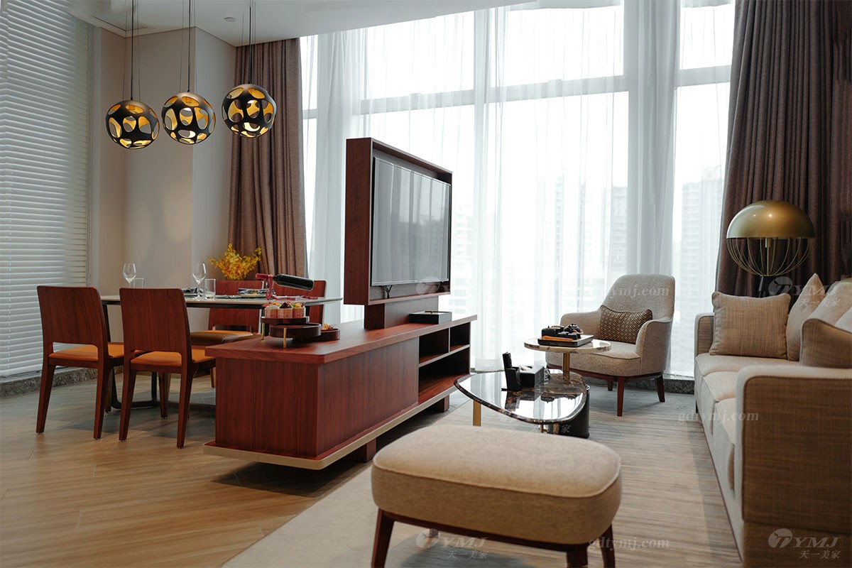 全景套房客廳兩面分別擁有超大落地窗,光線充足,視野開闊,薄薄的輕紗窗簾,隔絕了外界的喧囂與塵埃,更是增添了房間內一絲悠閑浪漫的氛圍;整個空間的色調,由淺到深,完美融合為一體,客餐廳互相連通,與精心打造的一體開放式餐廚空間,在無形中組合成一個開放、簡約、高雅的功能實用性很強的生活區域,臥室同樣擁有超大落地玻璃窗,景觀視野廣闊,深色的墻面背景裝飾,棕褐色皮藝床屏,時尚球形燈光造型,營造了一種簡約時尚,靜謐穩重的氛圍。