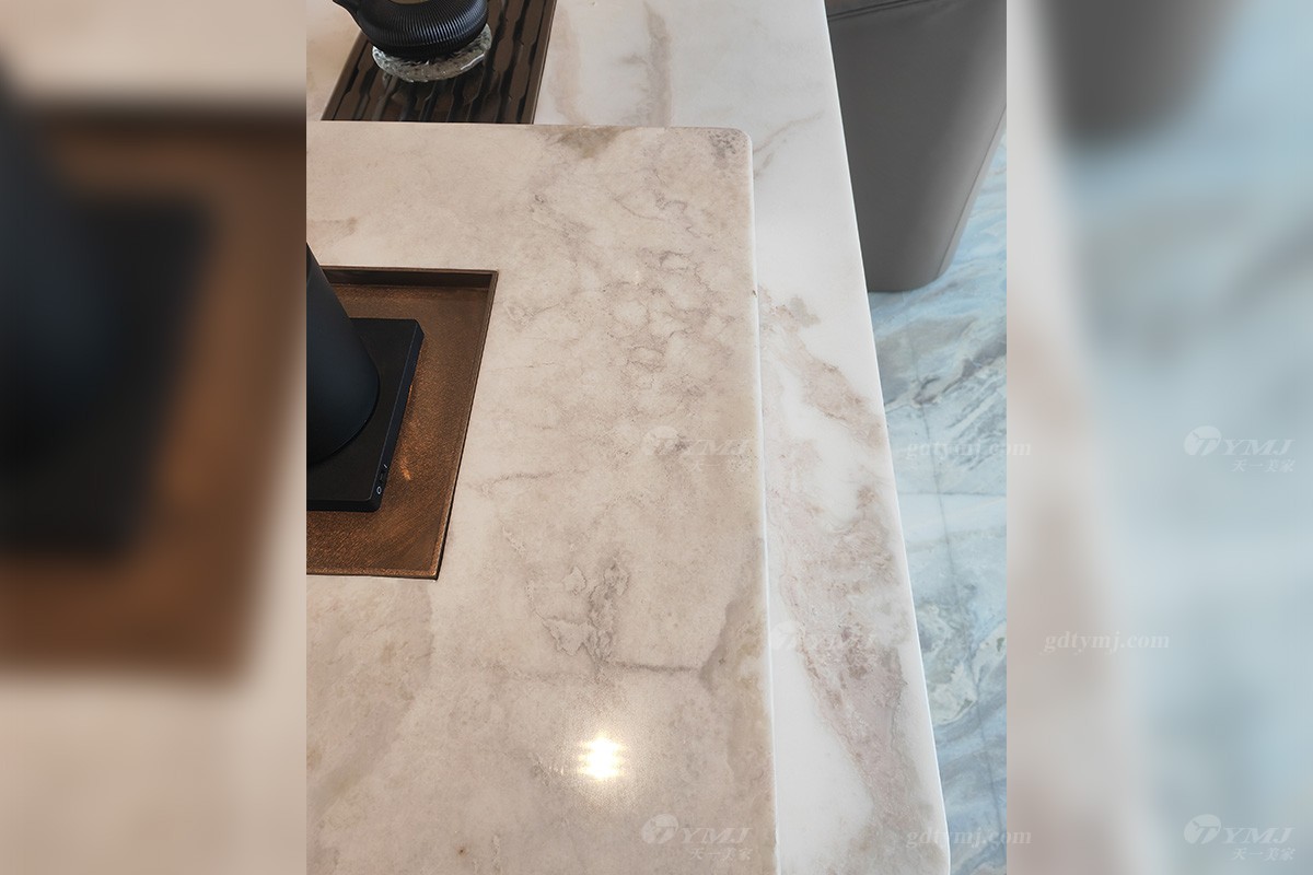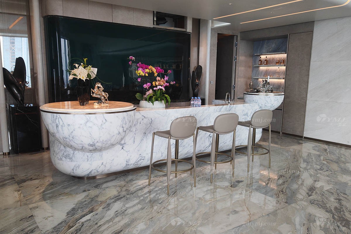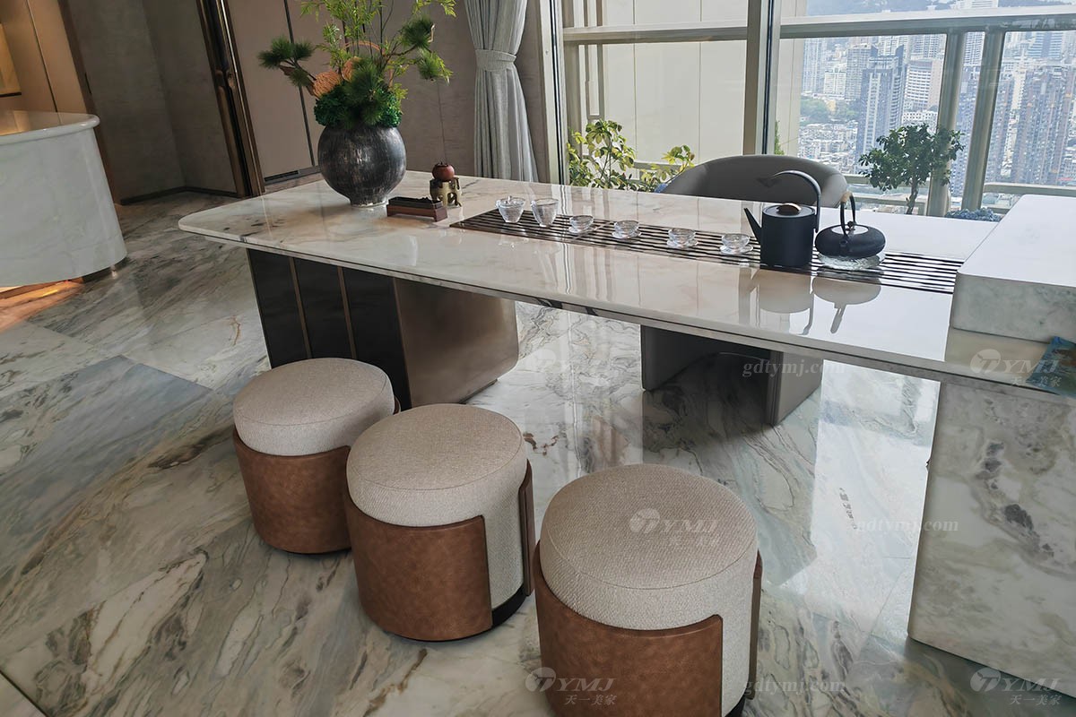開放式的茶室區,視野非常開闊,空間通透,同樣采光充足,中間一張長達2米多的大理石長茶臺,由精選天然白色大理石結合實木精心打造而成,鑲嵌金屬條配飾,細節感滿滿。閑余時分,約上三五知己抑或獨自一人,可一邊慢慢品茶一邊欣賞外面無盡美景,甚是愜意。