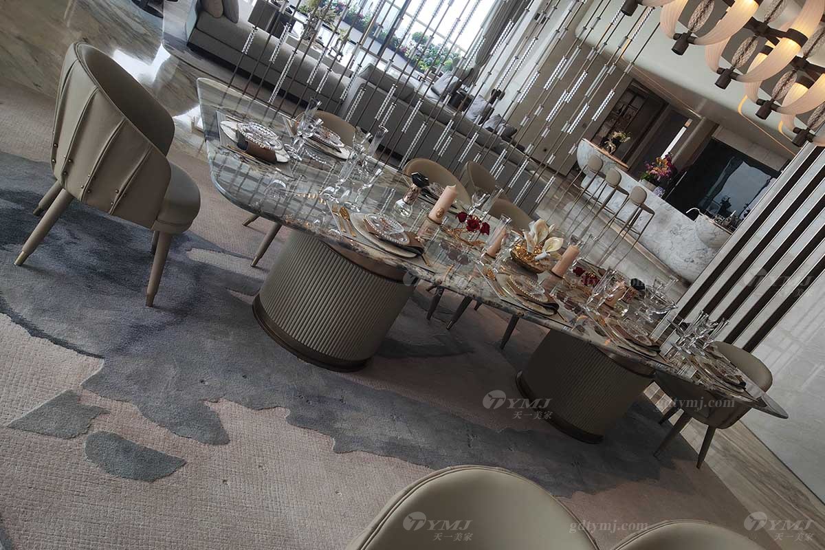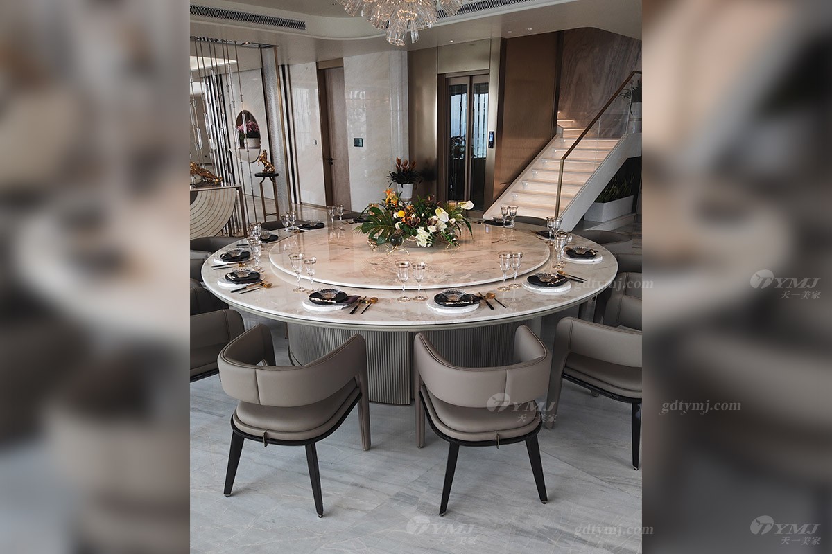 由客廳透過一道時尚的金屬裝飾隔斷,便是餐廳區,餐廳區共分兩部分,分別為可容納10人座的西式大理石長餐桌,底座由兩個大圓柱體支撐著整個天然大理石臺面,奢華又大氣,讓你感受到來自西餐的浪漫。與之對應的便是一張可容納12人的大圓形餐臺,時尚灰色皮藝餐椅,與圓餐臺大理石色調搭配完美融合、和諧統一,彰顯高雅、奢華感十足。