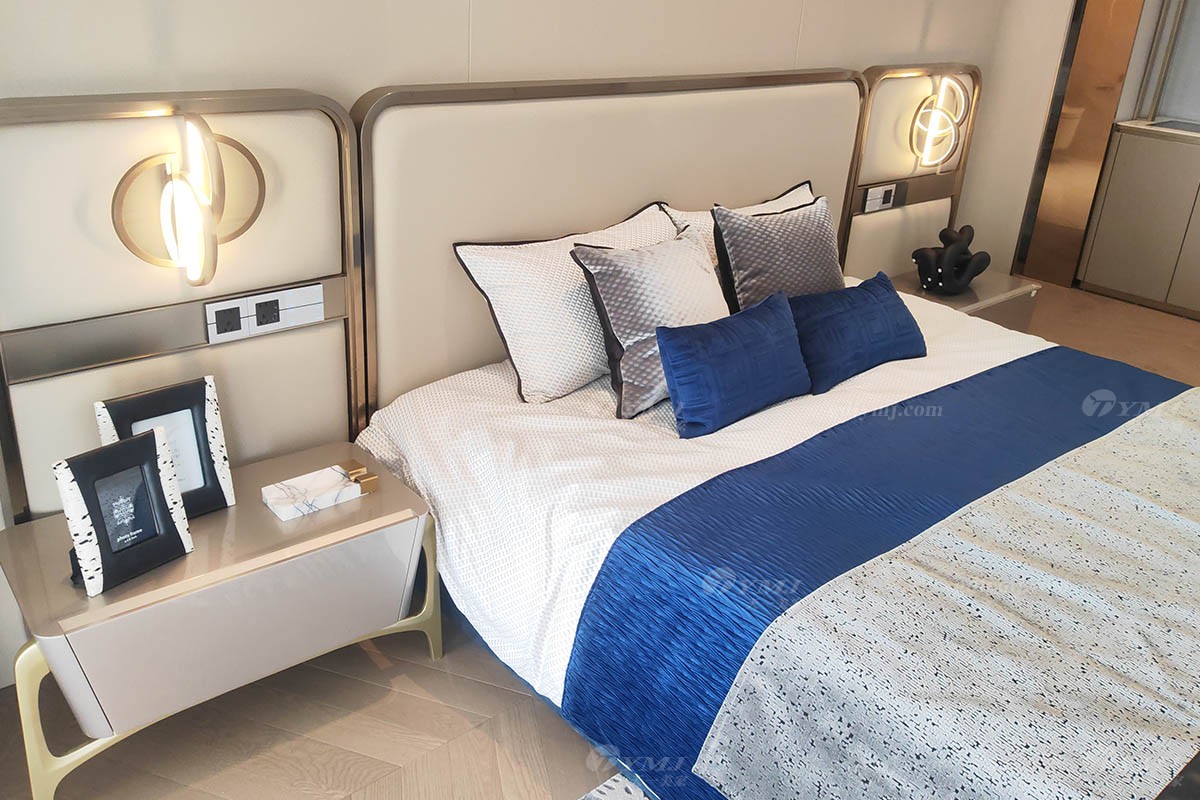 臥室自帶大陽臺,由超大落地玻璃窗隔絕了來自外界的喧囂與侵擾,還室內一片安寧,但是并不妨礙溫暖的陽光肆意灑進來,帶給人通透明亮的心境享受;寬大的床屏由金屬框架結合實木及布藝工藝精制而成,色調與墻壁背景色融為一體,低調而不失高雅,創意懸掛式的床頭燈,形狀獨特,暖色調光源,增添了溫馨氛圍,整個臥室空間從設計到家具、軟裝搭配布局集奢華、實用性、溫馨舒適于一體。