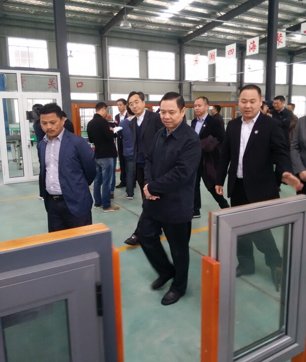 河南省委常委、常務副省長李克、副省長王艷玲在信陽天一窗業公司參觀木包鋁樣品