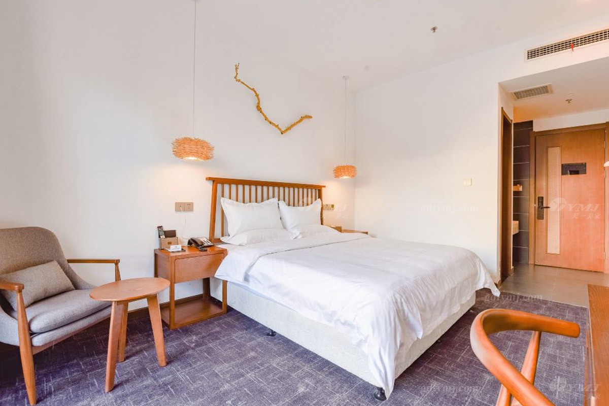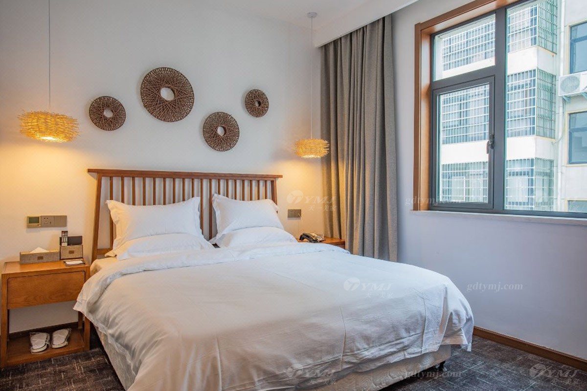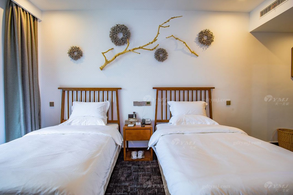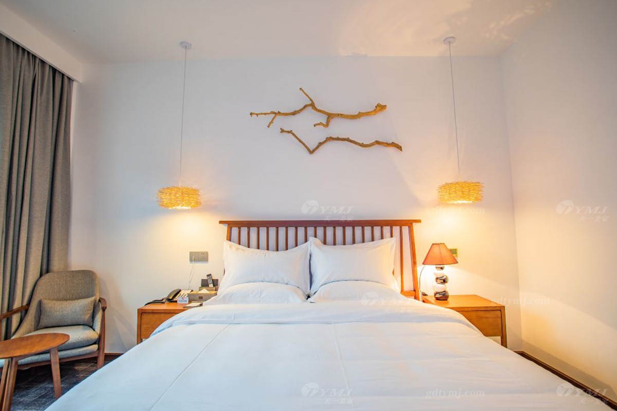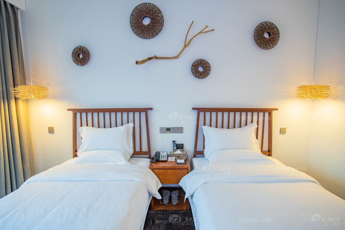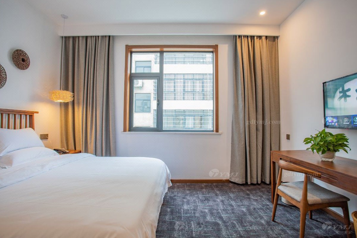 項目介紹:本項目為新縣蔓鄉·大別山居名宿酒店位于河南新縣金蘭大道民宿學院、許世友將軍墓等旅游景點,周邊環境秀美,結合了民宿和商務酒店的整體設計風格,鑒于此,家具產品的設計自然是以目前更貼近民宿意境的現代新中式風格為設計理念,整體線條簡約流暢,材料以原木實木為主,原木色的色調搭配灰色、白色、黑色元素,加上民宿風的燈飾、掛件、綠植等軟裝飾品的點綴,給人一種別具一格、清新雅致的意境,既特顯檔次,又簡約大方。柔和的燈光,軟硬適中的床墊,干凈簡潔的室內空間,溫暖而舒適。