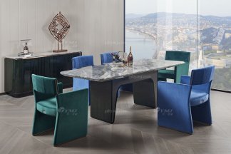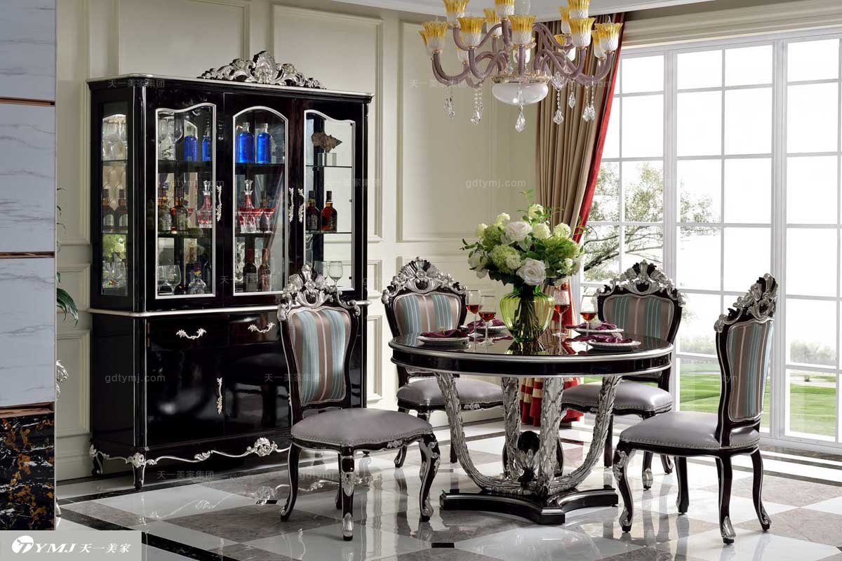 高端奢華法式實木家具亮黑色雕花圓餐臺+餐椅+ 三門酒柜