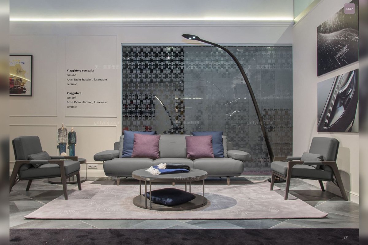 奢華大氣豪宅家具品牌客廳輕奢現代鐵灰色真皮軟包沙發+茶幾