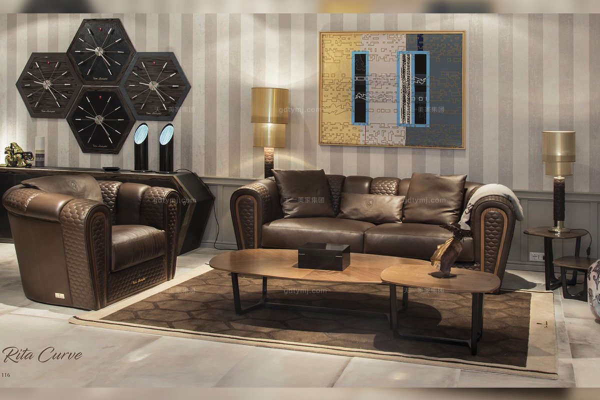 高端別墅豪華家具品牌客廳輕奢現代深咖色真皮車格子單雙人位沙發組合