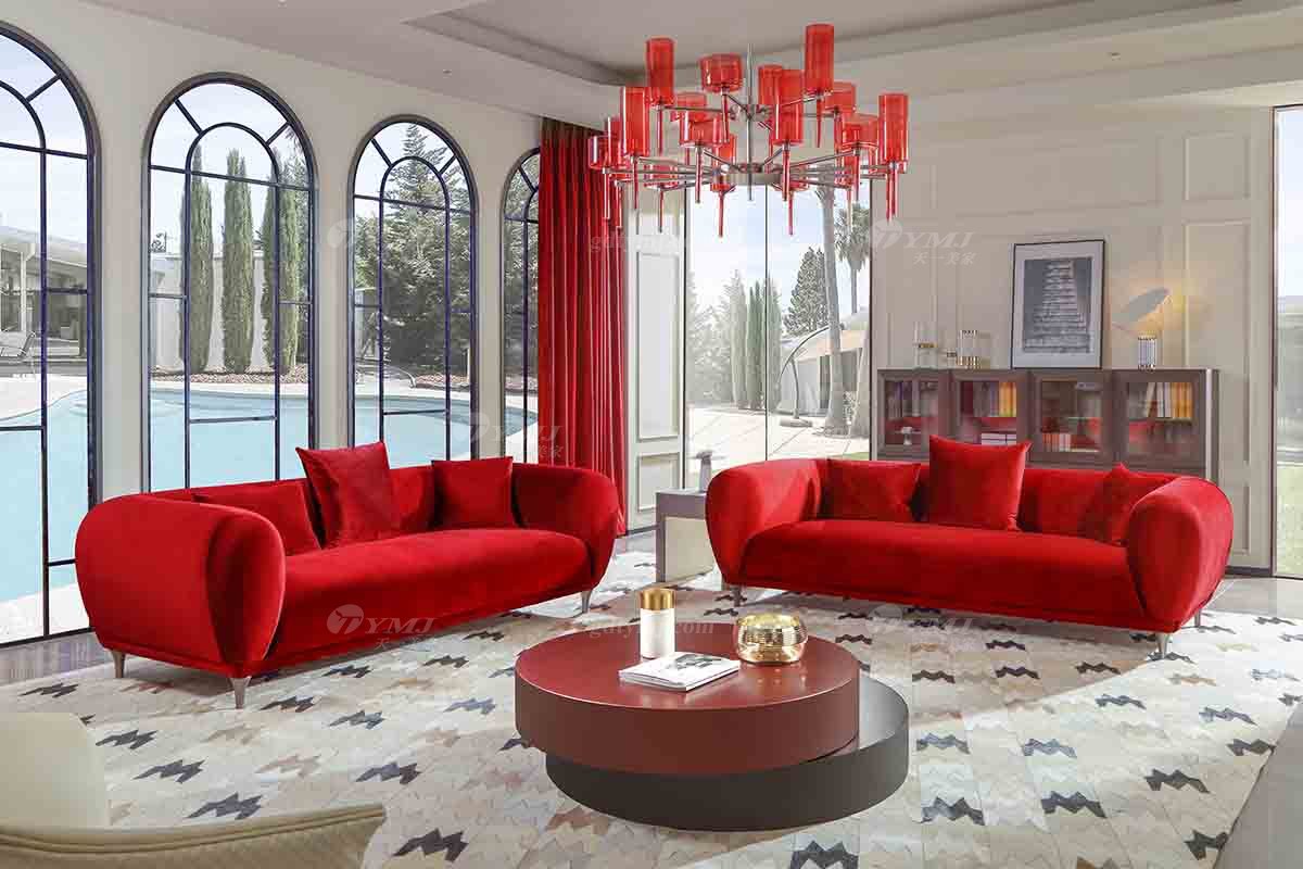 現代輕奢別墅會所品牌家具紅色絨布藝三位沙發