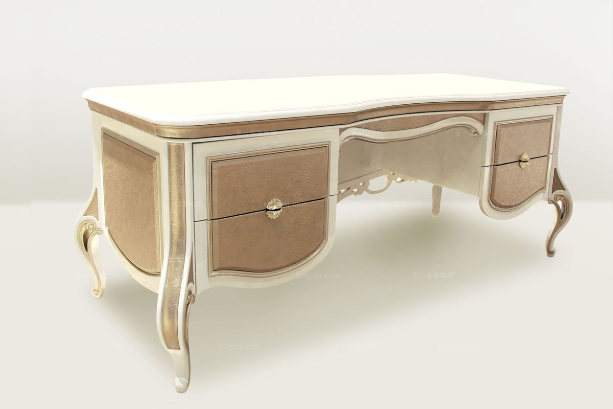 局部解說:這款書桌采用大面積的特紋皮,它是由設計師根據產品風格與色彩,精心設計出花紋,開模壓花,并采用是純天然意大利進口頭層小黃牛皮壓花,經過18道工序處理后才形成這種效果,花面凹凸有致,邊緣并經過明線車縫,邊緣平滑無毛邊。奶白色高亮光雙色鋼琴漆配上鍍金鏤空雕花,讓您的家看上去華麗貴氣,簡潔凝練。精心設計的貝殼狀拉手,精致時尚。德國柏隆滑軌,抽屜滑軌拉出時阻力小,平穩,沒有異響,靜音,回彈力和順滑度好,抽屜推回去時有緩沖自動回收的功能,充分保障了人的安全與家具的安全。抽屜采用實木增加耐用度,在抽屜內底更是采用深咖色絨布來提升品質感,完美體現細節。獨有的奶白色高亮光雙色鋼琴漆面,雙色工藝復雜,花紋立體,質感強,視覺效果類似石面的質感。您看這款書桌的細節體現處,書桌360度美感體現,連底部都采用波浪型曲線來體現線條感。書桌背面采用四抽,簡潔分明,方便物品存放及使用,更具人性化。